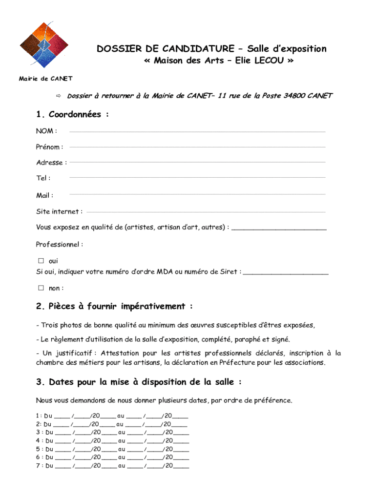 DOSSIER DE CANDIDATURE Sale deposition Madison DES Arts Elie LE COU Masai de CANETDossier returner la Masai de CANET 11 rue DE la Post 34800 CANET1. Coordinates : NOT : Prom : Address : Tel : Mail