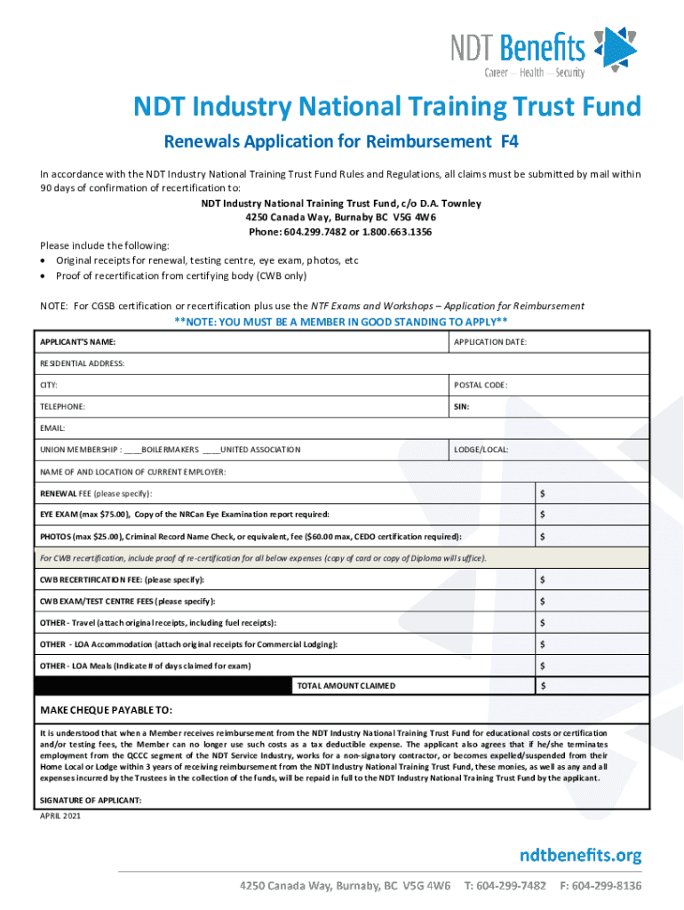 NDT Industry National Training Trust Fund Renewals Application for Reimbursement F4 In accordance with the NDT Industry National Training Trust Fund Rules and Regulations, all claims must be submitted