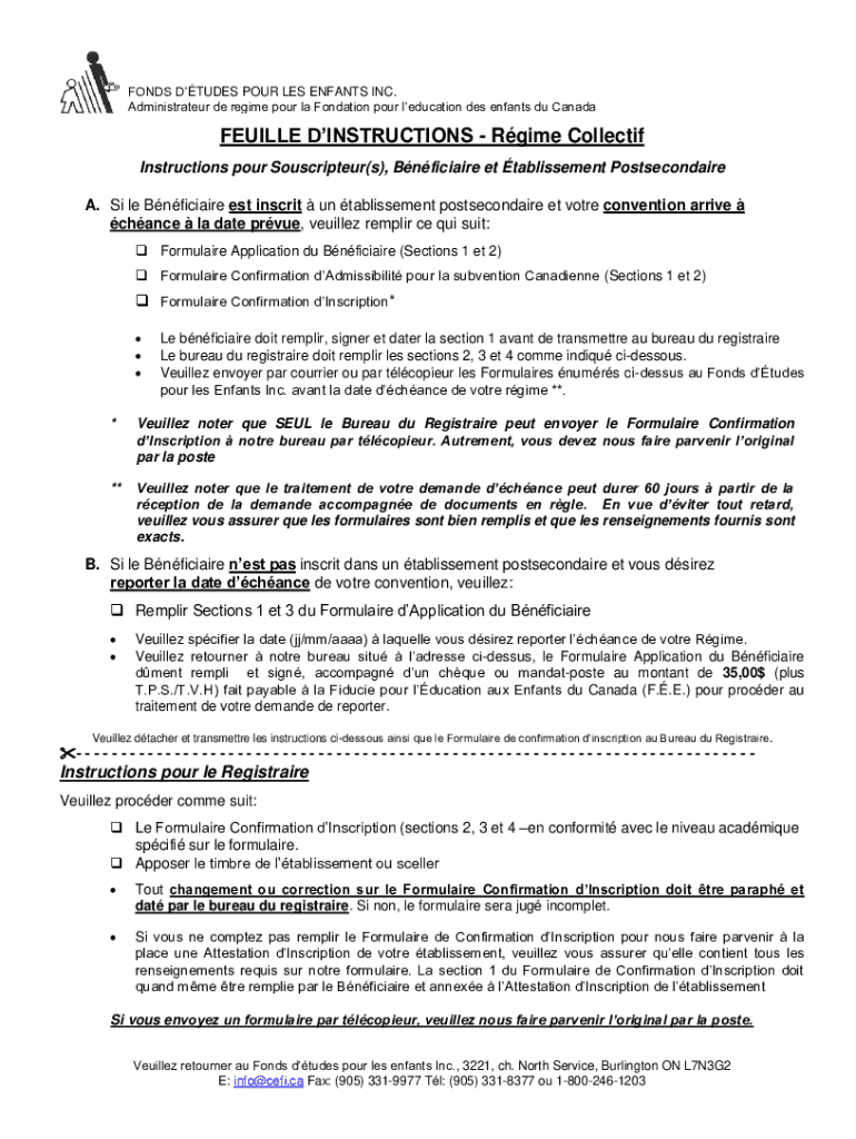 FINDS Études POUR LES INFANTS INC. Administrator DE regime pour la Foundation pour education DES infants Du CanadaFEUILLE INSTRUCTIONS Regime Collect if Instructions pour Souscripteur(s), Bnficiaire