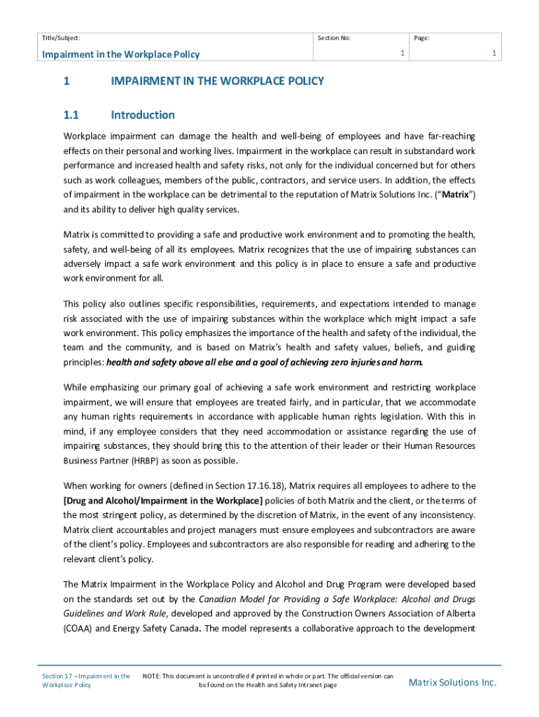 Title/Subject:Section No:Impairment in the Workplace Policy1IMPAIRMENT IN THE WORKPLACE POLICY1.1IntroductionPage:11Workplace impairment can damage the health and wellbeing of employees and have far-reaching