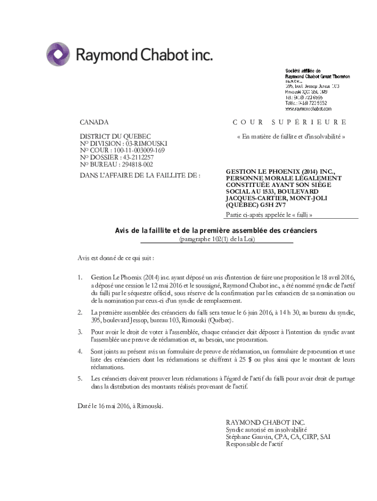 CANADA O UR DISTRICT DU QUEBEC NO DIVISION : 03RIMOUSKI NO FOUR : 10011003009169 NO DOSSIER : 432112257 NO BUREAU : 294818002 DAYS L\'AFFAIRS DE LA FAILLE DE :S U P R I E U R E En mature DE fail lite