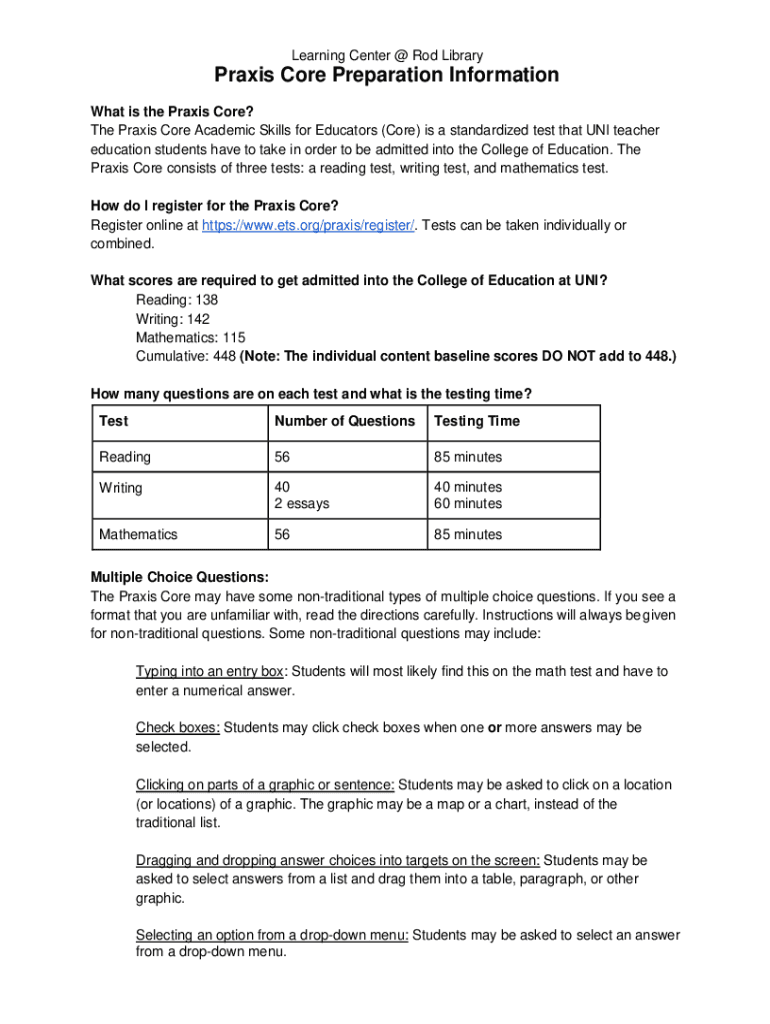 Learning Center @ Rod LibraryPraxis Core Preparation Information What is the Praxis Core? The Praxis Core Academic Skills for Educators (Core) is a standardized test that UNI teacher education students