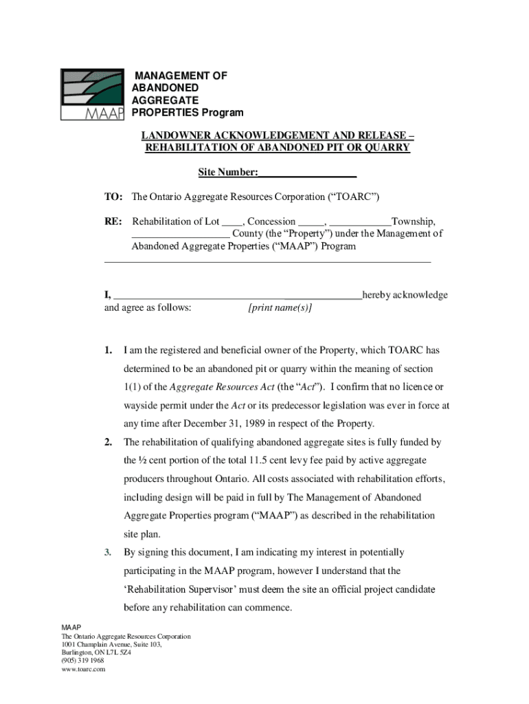 MANAGEMENT OF ABANDONED AGGREGATE PROPERTIES Program LANDOWNER ACKNOWLEDGEMENT AND RELEASE REHABILITATION OF ABANDONED PIT OR QUARRY Site Number:___ TO: The Ontario Aggregate Resources Corporation