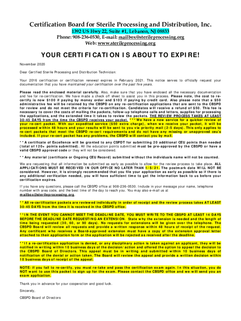 Certification Board for Sterile Processing and Distribution, Inc. 1392 US Hwy 22, Suite #1, Lebanon, NJ 08833 Phone: 9082360530, Email: mailbox@sterileprocessing.org Web: www.sterileprocessing.orgYOUR