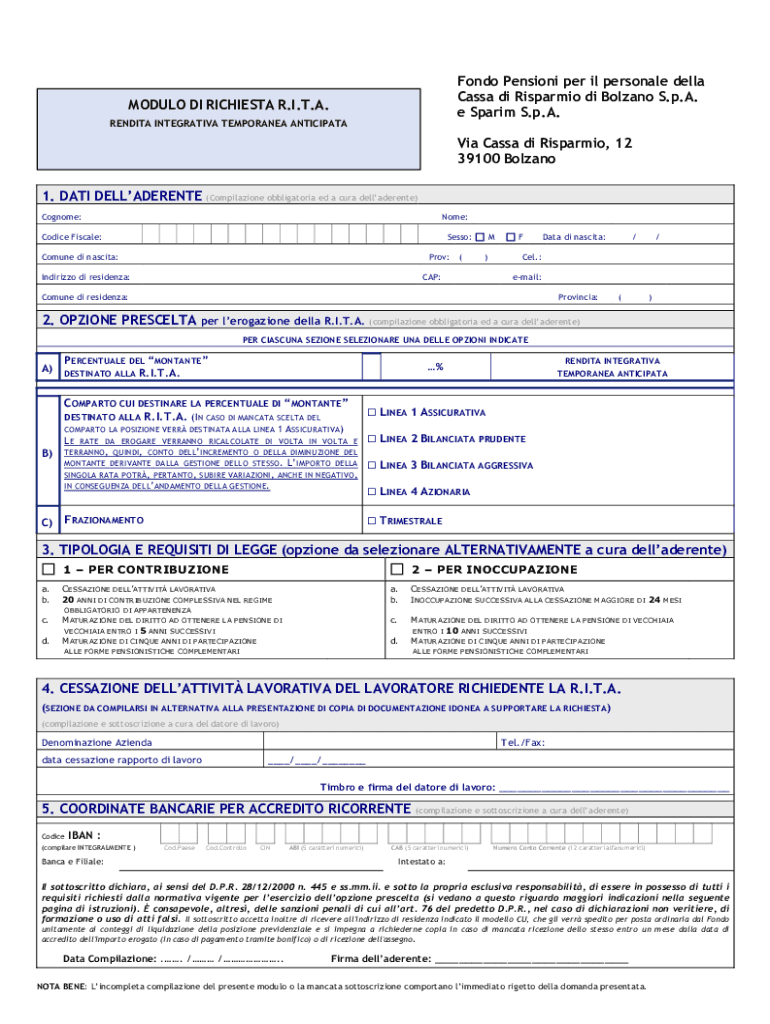 Fond Pension per IL personal Della Cassia di Rosario di Bolzano S.p.A. e Spa rim S.p.A.MODULO DI RICHEST R.I.T.A. REND ITA INTEGRATIVE TEMPORARY ANTICIPATAVia Cassia di Rosario, 12 39100 Bolzano 1.