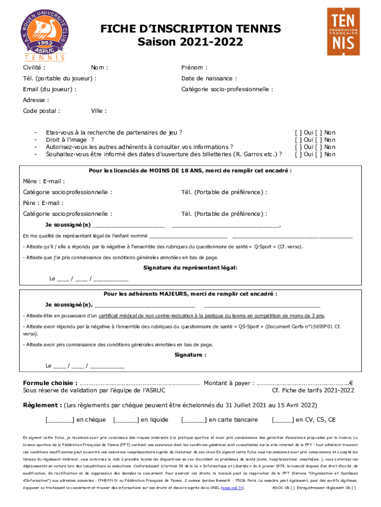 FICHE INSCRIPTION TENNIS Saigon 20212022 Civility :Not :Prom :Tl. (portable Du joker) :Date de Renaissance :Email (Du joker) :Categories socioprofessionnelle :Address : Code postal : Villa :Nervous