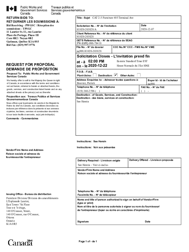 1 1RETURN BIDS TO: RETURNER LES COMMISSIONS :Title Suet CAT 25 Furniture 405 Terminal Avoid Receiving PW GSC / Reception DES sou missions TP SGC 11 Laurie St./11, rue Laurie Place du Portage, Phase