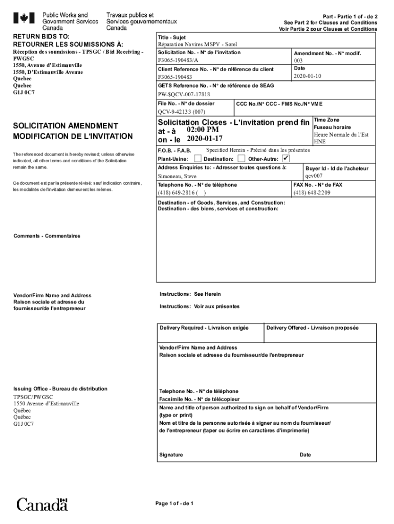 RETURN BIDS TO: RETURNER LES COMMISSIONS : Reception DES sou missions TP SGC / Bid Receiving PW GSC 1550, Avenue d\'Estimauville 1550, D\'Estimauville Avenue Quebec G1J 0C7Part Parties 1 of DE 2 See