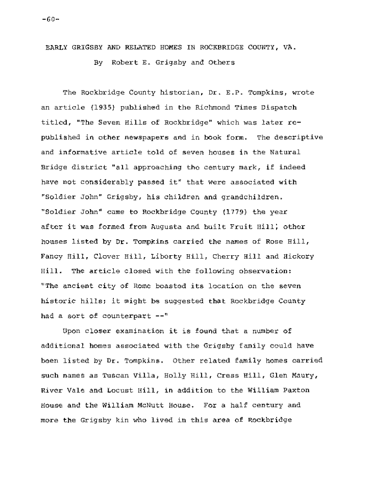 60EARLY GRIGSBY AND RELATED HOMES IN STOCKBRIDGE COUNTY, VA. By Robert E. Grigsby and Others Rock bridge County historian, Dr. E.P. Tompkins, wrote an article (1935) published in the Richmond Times