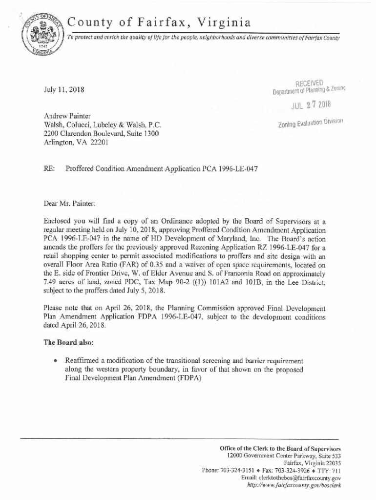 County of Fairfax, Virginia To protect and enrich the quality of life for the people, neighborhoods and diverse communities of Fairfax CountyRECEIVED Department of Planning & Zonin9July 11, 2018JUL
