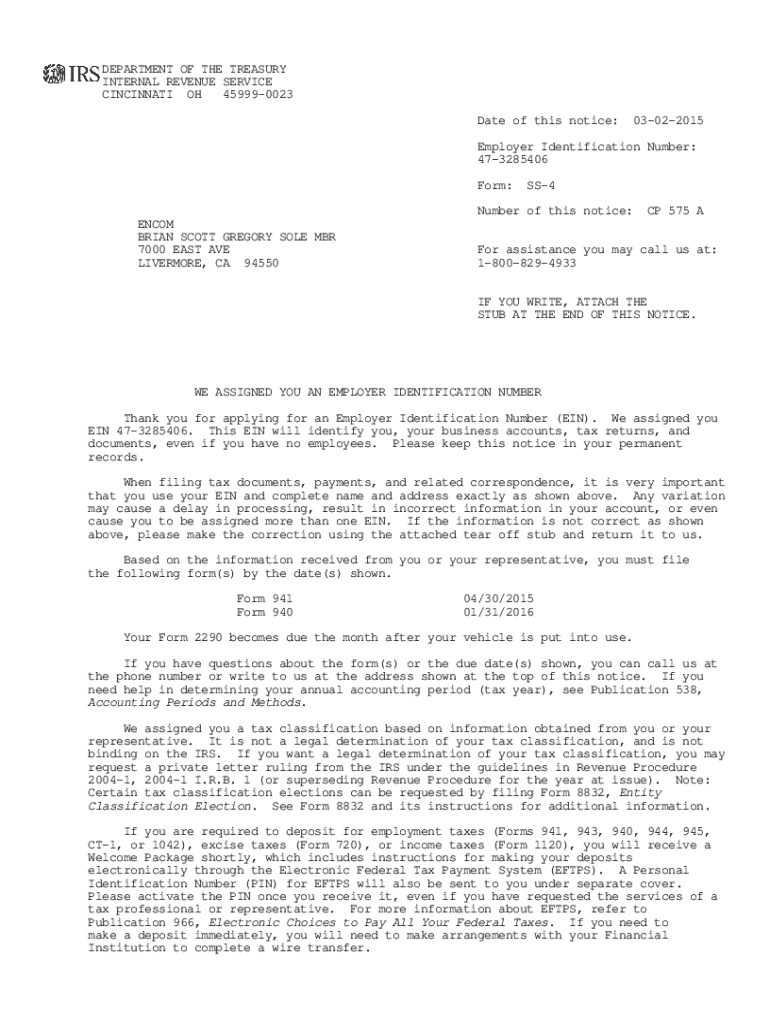 DEPARTMENT OF THE TREASURY INTERNAL REVENUE SERVICE CINCINNATI OH 459990023 Date of this notice:03022015Employer Identification Number: 473285406 Form:SS4Number of this notice: EN COM BRIAN SCOTT