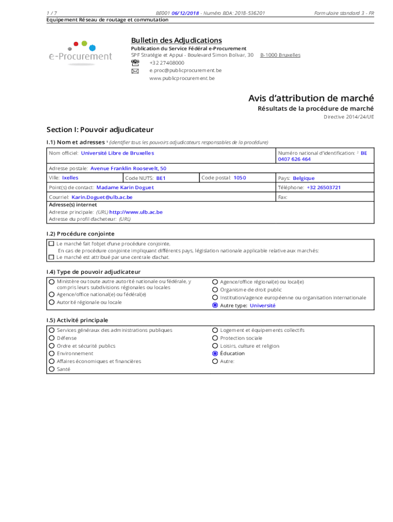 1/7 BE00106/12/2018 Humor BDA: 2018536201 Equipment Roseau de outage et commutationFormulaire standard 3 Bulletin DES Adjudications Publication du Service Feral procurement SPF Strategic et Apply
