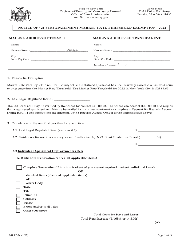 State of New York Division of Housing and Community Renewal Office of Rent Administration Website: www.hcr.ny.govGertz Plaza 9231 Union Hall Street Jamaica, New York 11433NOTICE OF 421a (16) APARTMENT