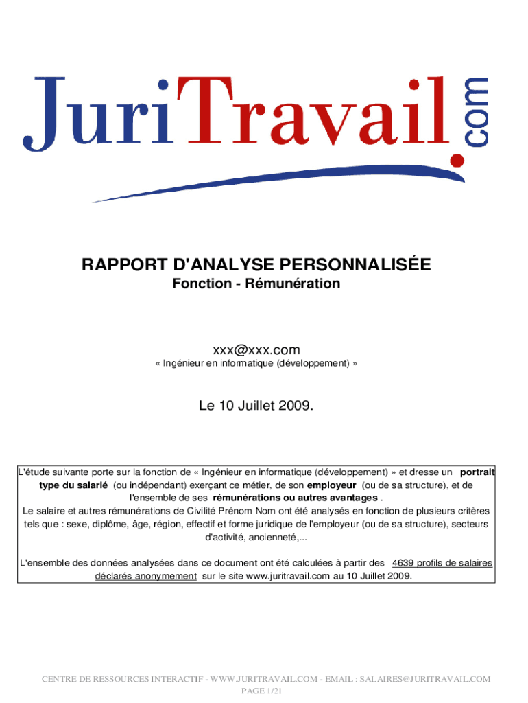 RAPPORT D\'Analyze PERSONALIZE Function Rmunrationxxx@xxx.com Engineer en informative (development) Le 10 Bullet 2009. L\'tube private port SUR la function DE Engineer en informative (development)