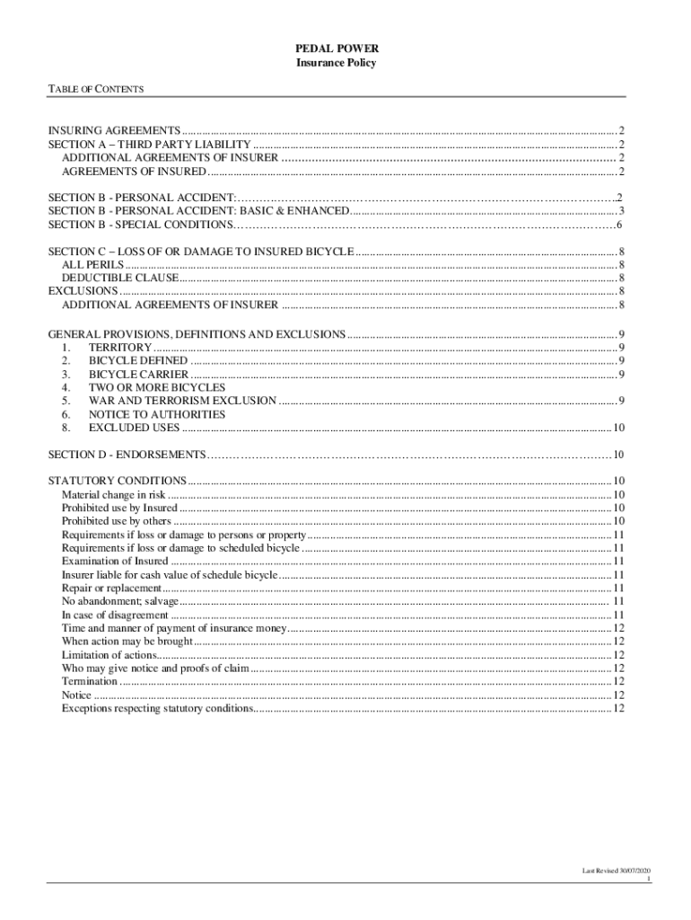 PEDAL POWER Insurance Policy TABLE OF CONTENTSINSURING AGREEMENTS .........................................................................................................................................................