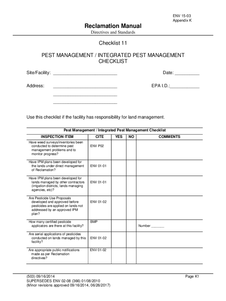 ENV 1503 Appendix Reclamation Manual Directives and StandardsChecklist 11 PEST MANAGEMENT / INTEGRATED PEST MANAGEMENT CHECKLIST Site/Facility: ___ Address:Date: ______EPA I.D.:______ ___Use this
