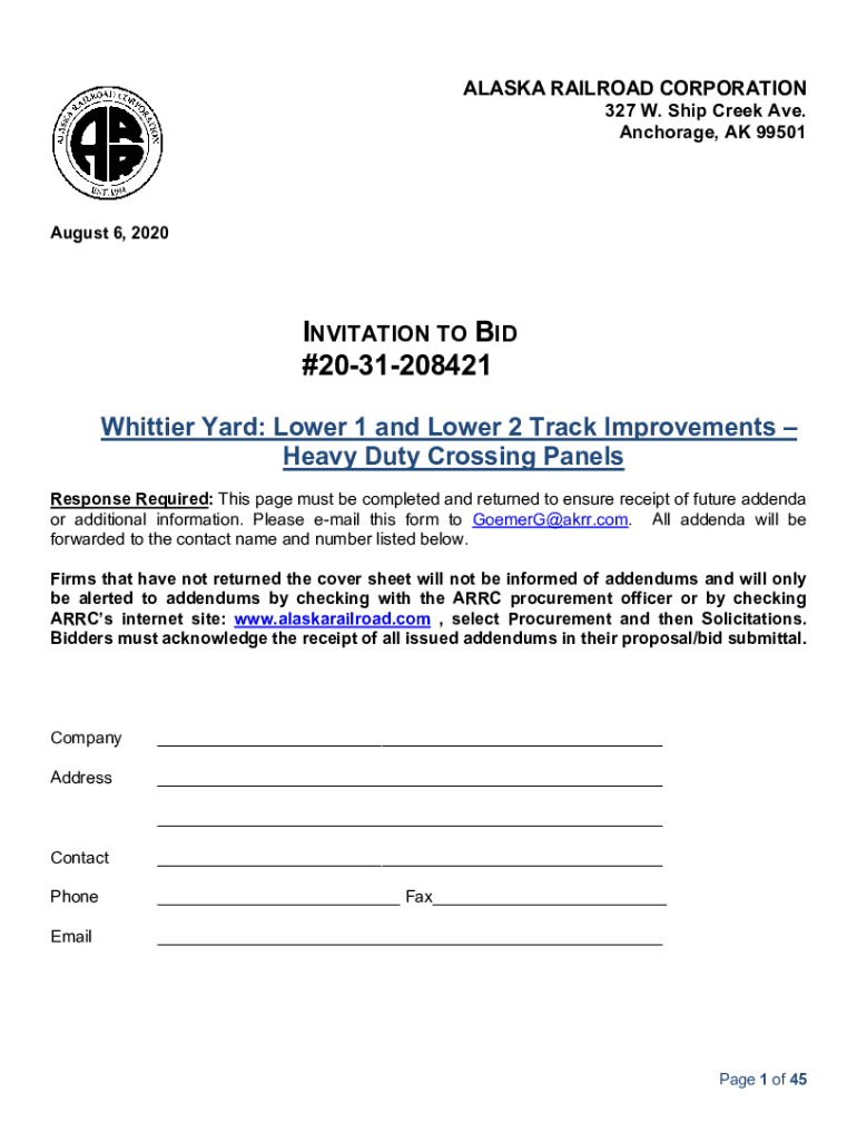 ALASKA RAILROAD CORPORATION 327 W. Ship Creek Ave. Anchorage, AK 99501August 6, 2020INVITATION TO BID #2031208421 Whittier Yard: Lower 1 and Lower 2 Track Improvements Heavy Duty Crossing Panels Response