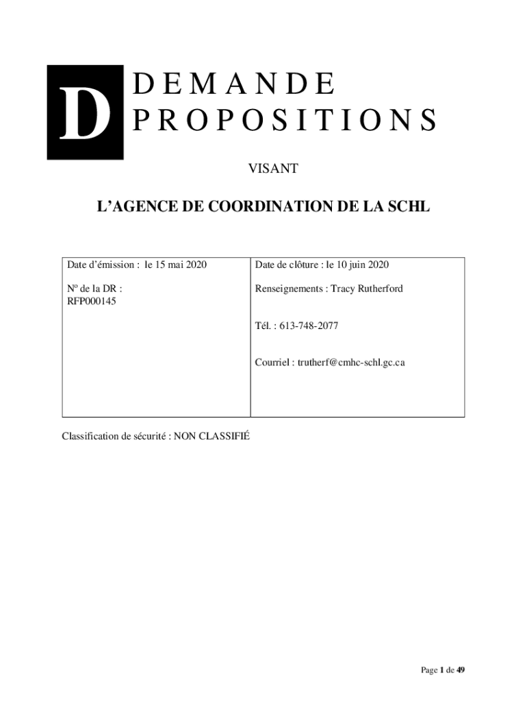 DEMAND PROPOSITIONS VISANTLAGENCE DE COORDINATION DE LA Schedule mission : LE 15 Mai 2020Date de culture : LE 10 join 2020No de la DR : RFP000145Renseignements : Tracy Rutherford Tl. 6137482077Courriel