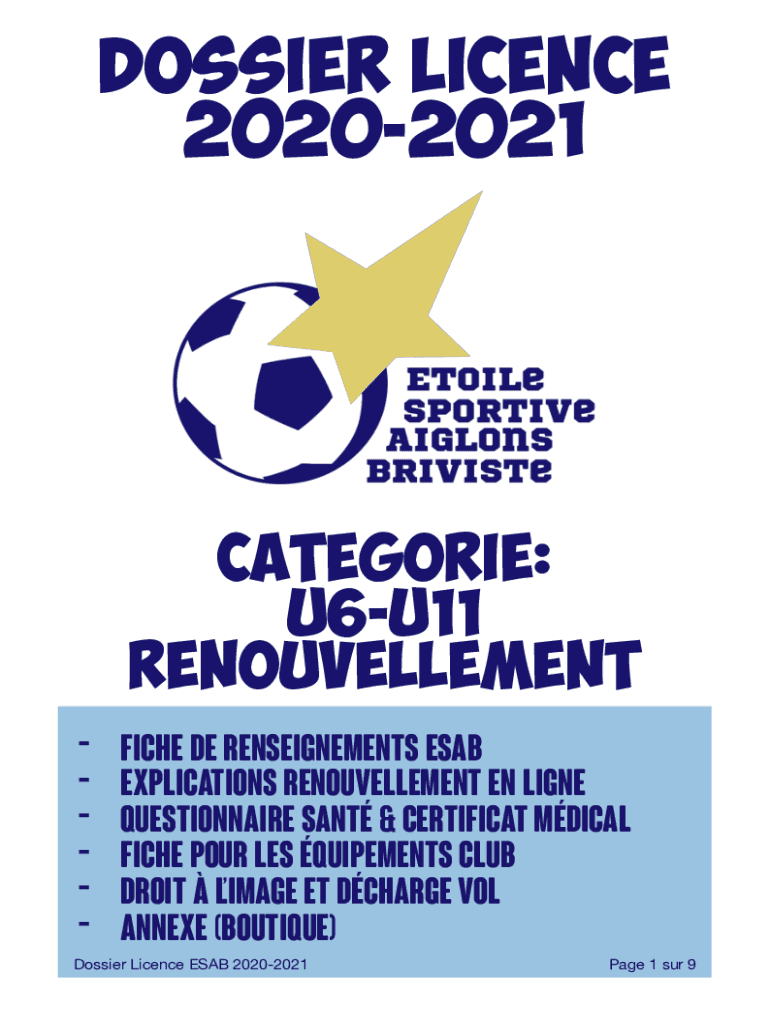 Dossier license 20202021Categorie: U6U11 Renouvellement Fiche DE restatements ESA Explications renouvellement en line Questionnaires ant & certificate medical Fiche pour LES equipments club Droid