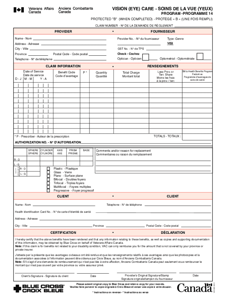 VISION (EYE) CARE SONS DE LA DUE (YEAR) PROGRAM 14PROTECTED \'B\' (WHEN COMPLETED) PRONG B (ONE FOIL TEMPLE) CLAIM NUMBER N DE LA DEMAND DE RGLEMENTPROVIDER name Provider No. N Du fournisseurAddress