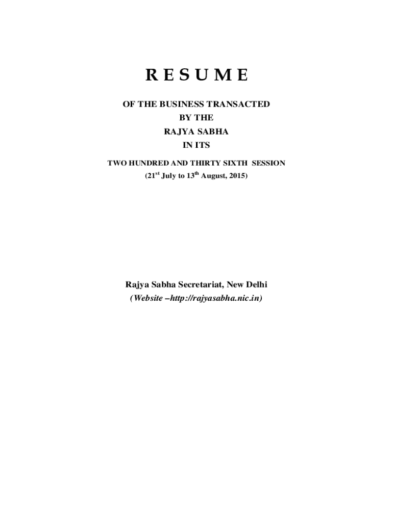 RESUME OF THE BUSINESS TRANSACTED BY THE RAJA SASHA IN ITS TWO HUNDRED AND THIRTY SIXTH Sessions (21st July to 13th August 2015)Raja Sasha Secretariat, New Delhi (Website HTTP://rajyasabha.NIC.in)Prefaces
