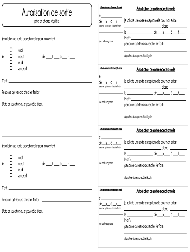 Authorization DE sortie (price en charge regular) JE solicited one sortie exceptionally pour Mon Enfant LEF f found Mari Jedi vendrediAutorisation de sortie exceptionnellele ___ DE ___h___ ___h___
