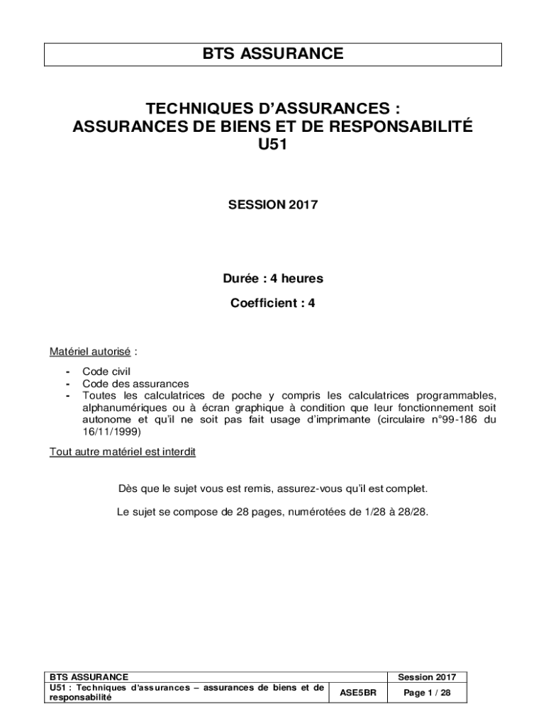 BTS ASSURANCE TECHNIQUES ASSURANCES : ASSURANCES DE BINS ET DE RESPONSIBILITY U51SESSION 2017Dure : 4 here Coefficients : 4Matriel actors : Code civil Code DES assurances Routes LES calculations de