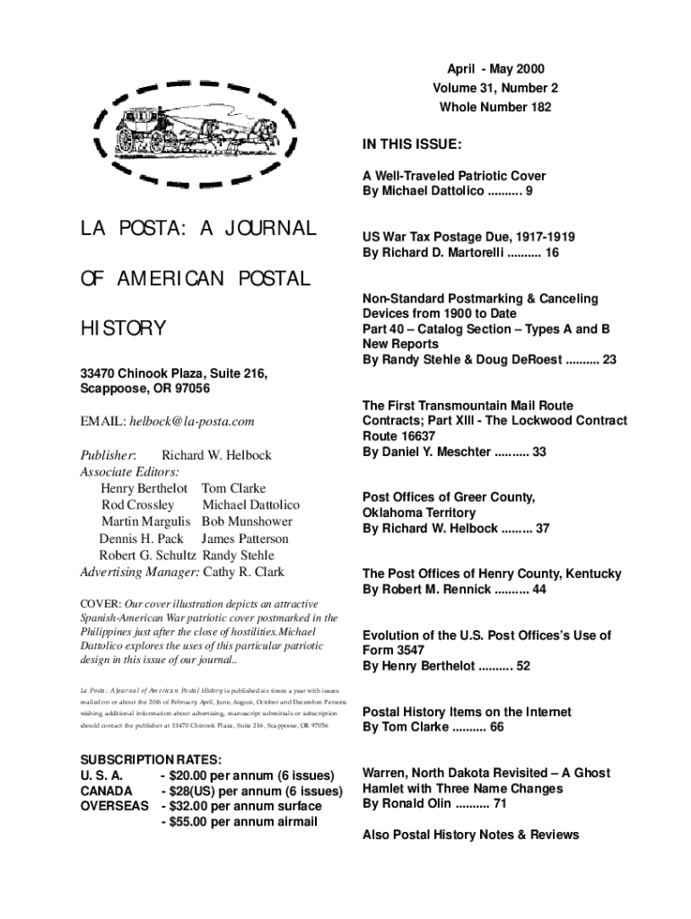 April May 2000 Volume 31, Number 2 Whole Number 182IN THIS ISSUE: A WellTraveled Patriotic Cover By Michael Catholic .......... 9LA POST: A JOURNAL OF AMERICAN POSTAL HISTORY US War Tax Postage Due,
