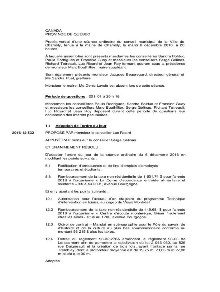 CANADA PROVINCE DE QUEBEC Procès-verbal dune since ordinary Du Conrail municipal DE la Villa de Chambly, tenure la Masai de Chamber, LE Mari 6 December 2016, 20 here. LaBelle assemble sent presents