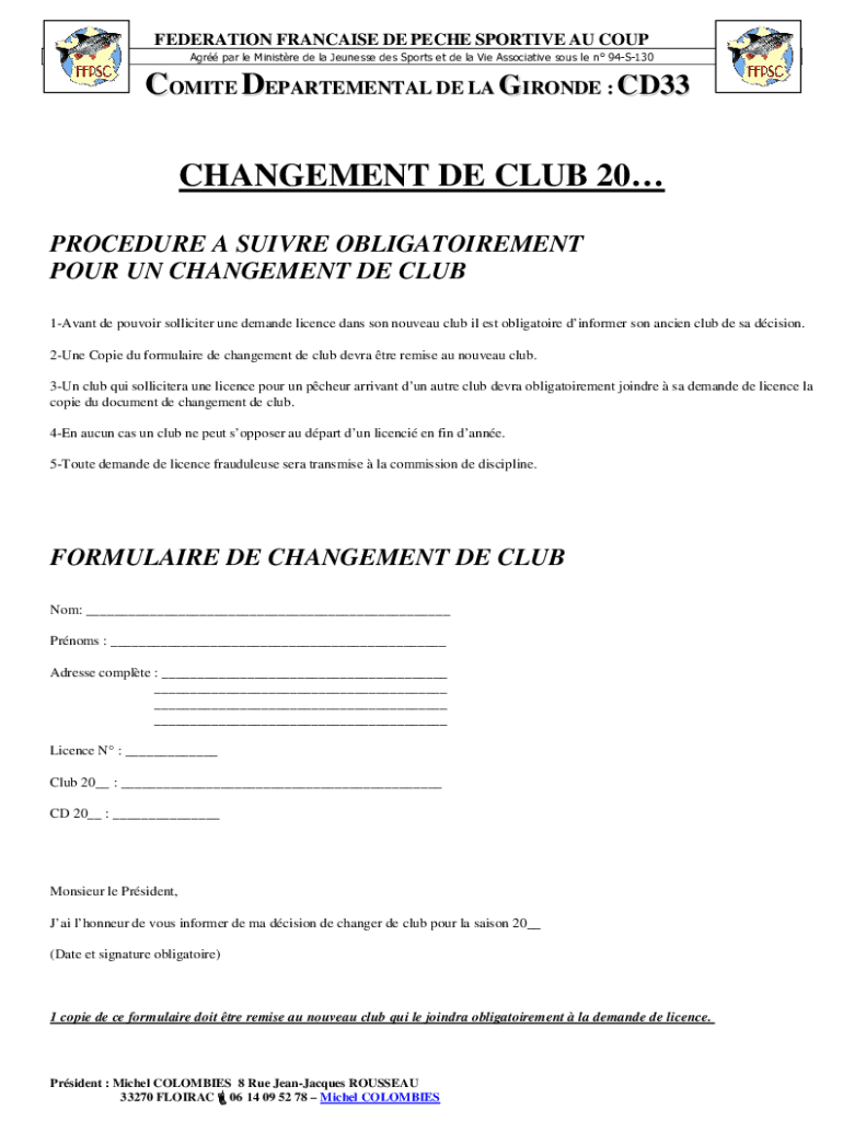 FEDERATION FRANCHISE DE PEACE SPORTIVE AU COUP AGR par LE Minister de la Tennessee DES Sports et de la Vie Associative sous LE n 94S130COMITE DEPARTMENTAL DE LA GIRONDE : CD33CHANGEMENT DE CLUB 20