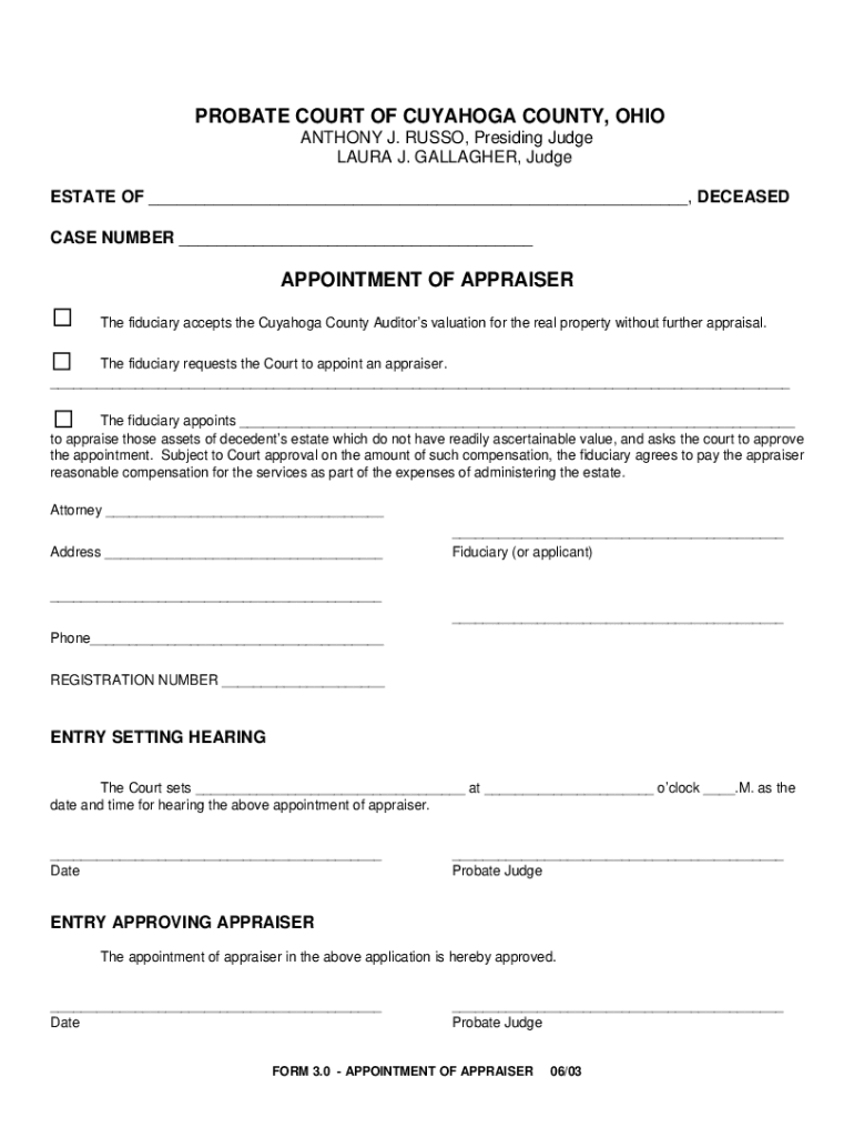 PROBATE COURT OF CUYAHOGA COUNTY, OHIO ANTHONY J. RUSSO, Presiding Judge LAURA J. GALLAGHER, Judge ESTATE OF ___, DECEASED CASE NUMBER ___APPOINTMENT OF APPRAISER9The fiduciary accepts the Cuyahoga