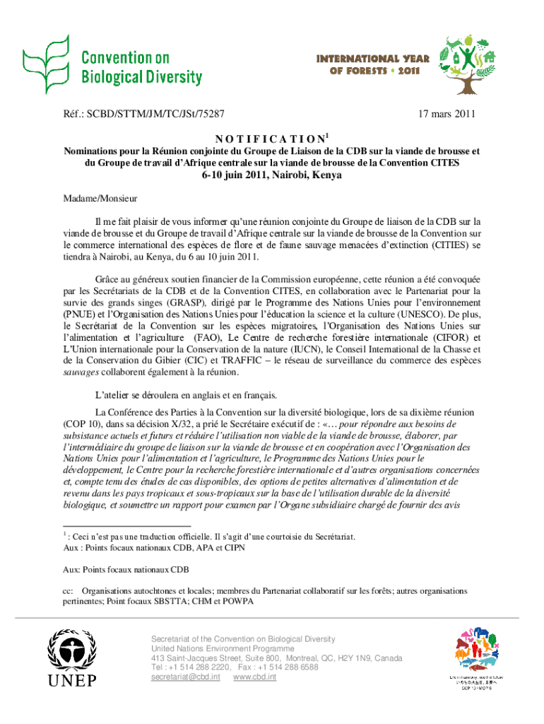 Rf.: SBD/STEM/JM/TC/Just/7528717 Mars 2011 N O T I F I C A T I O N1 Nominations pour la Union conjoint Du Group DE Liaison de la CDB SUR la viands DE blouse et Du Group DE travail antique central