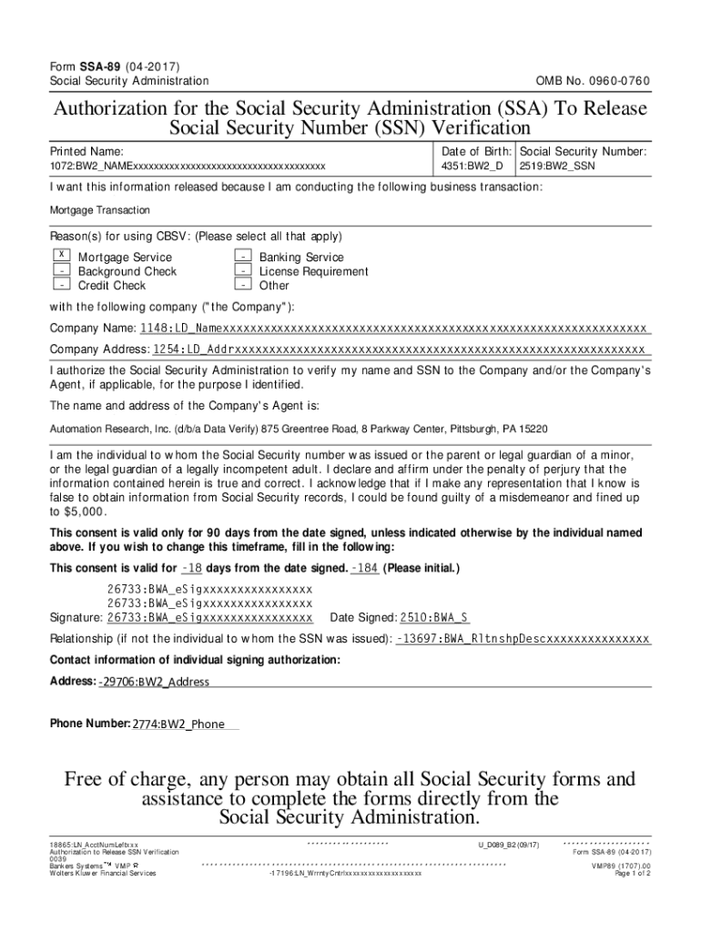 Form SSA89 (042017) Social Security Administration OMB No. 09600760Authorization for the Social Security Administration (SSA) To Release Social Security Number (SSN) Verification Printed Name: 2370:BWA_Namexxxxxxxxxxxxxxxxxxxxxxxxxxxxxxxxxxxxxxxxxx