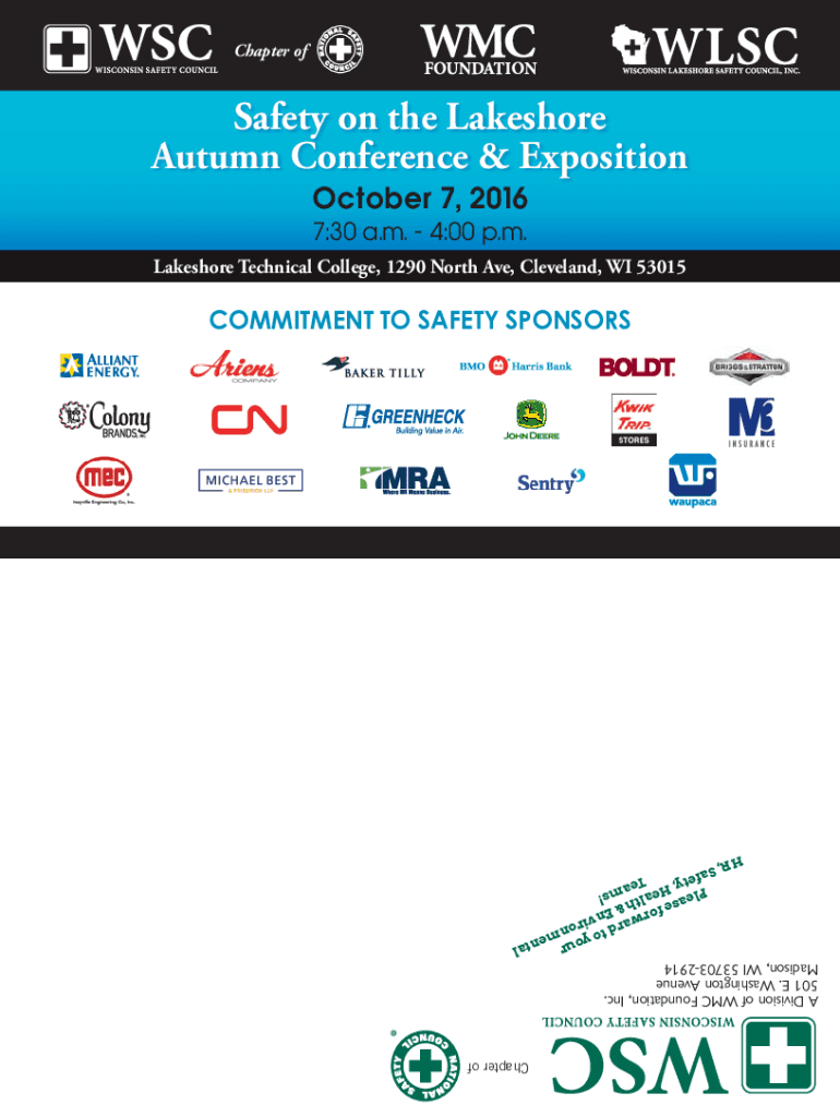 Chapter safety on the Lake shore Autumn Conference & Exposition October 7, 2016 7:30 a.m. 4:00 p.m. Lake shore Technical College, 1290 North Ave, Cleveland, WI 53015COMMITMENT TO SAFETY Sponsors our