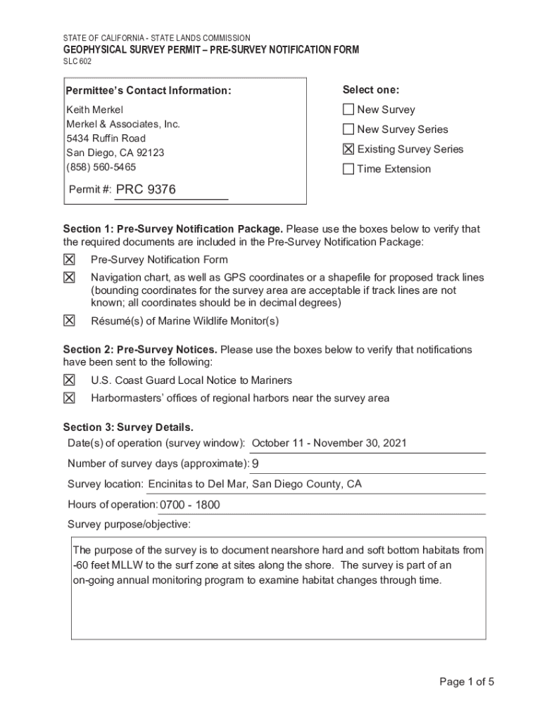 STATE OF CALIFORNIA STATE LANDS COMMISSIONGEOPHYSICAL SURVEY PERMIT RESURVEY NOTIFICATION FORM SLC 602Permittees Contact Information: Keith Merkel & Associates, Inc. 5434 Roughing Road San Diego,