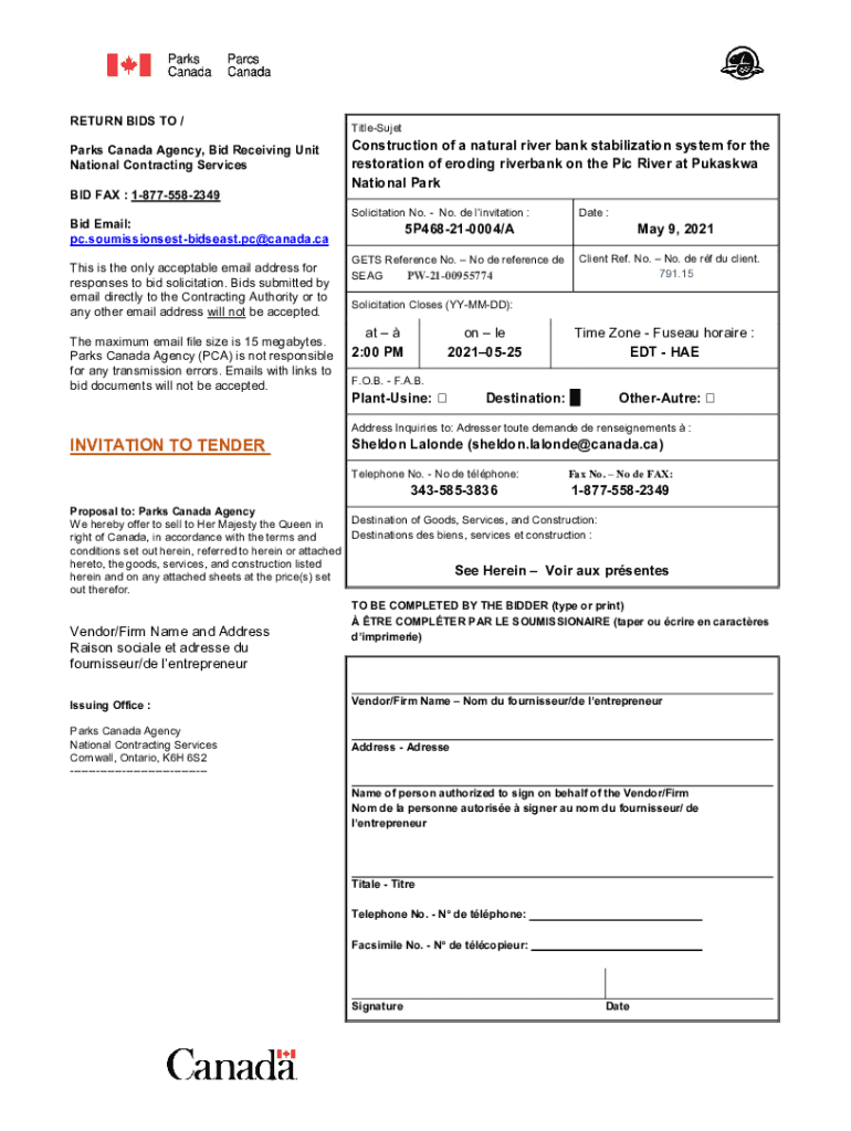 RETURN BIDS TO / Parks Canada Agency, Bid Receiving Unit National Contracting Services BID FAX : 18775582349TitleSujetConstruction of a natural river bank stabilization system for the restoration