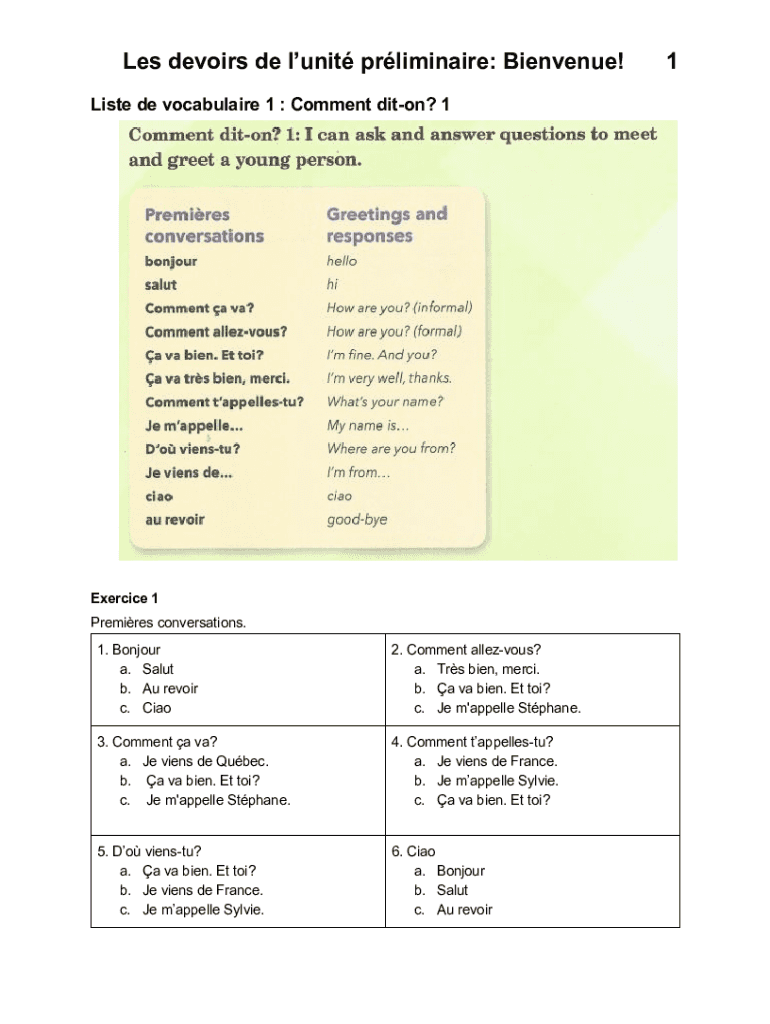 Les devours DE unit preliminary: Revenue! List de vocabulary 1 : Comment Dion? 1Exercice 1 Premises conversations. 1. Bonjour a. Salut b. Au Renoir c. Ciao2. Comment allegros? a. TRS Bain, merci.