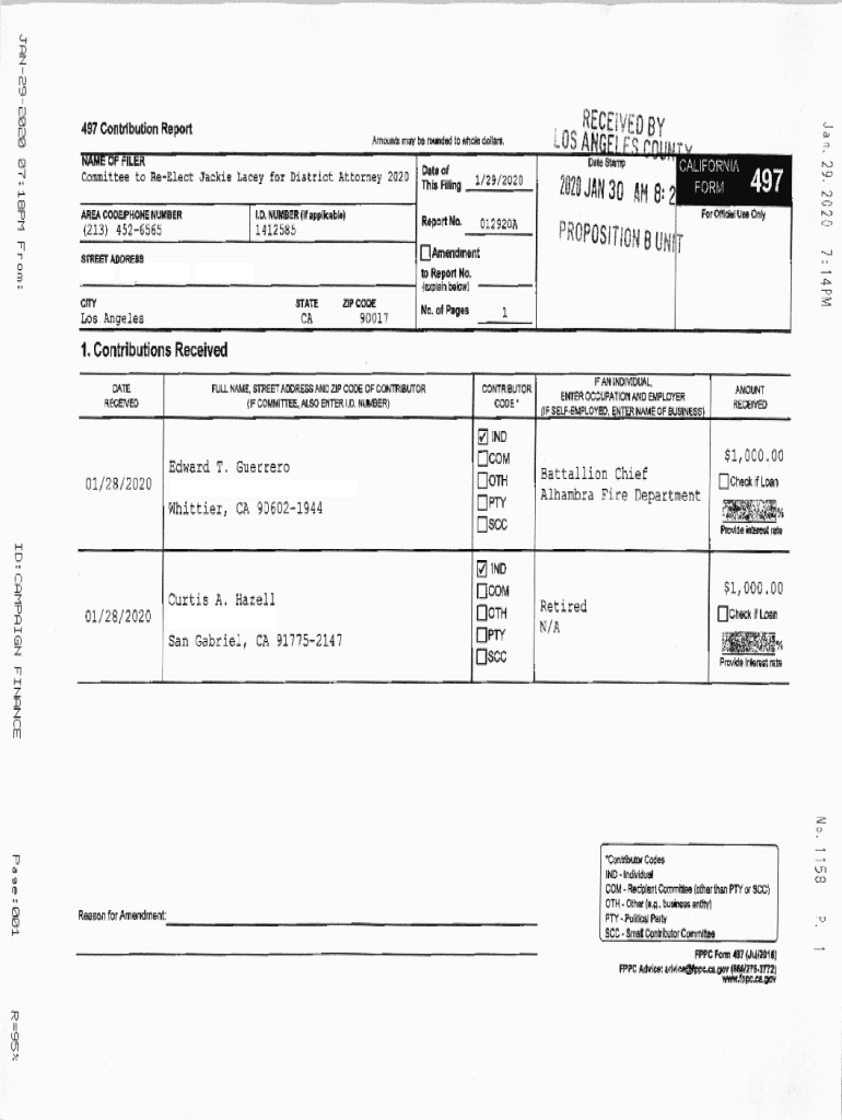 \'I Drug) IRU (S) ru497 Contribution Re portAmoun1\' Mary be rounded for whole d.allied.(S) (S). Committee to Reelect Jackie Lacey for District Attorney 2020Cata cf This FIiing7J 3:AREA COOEIPllONE