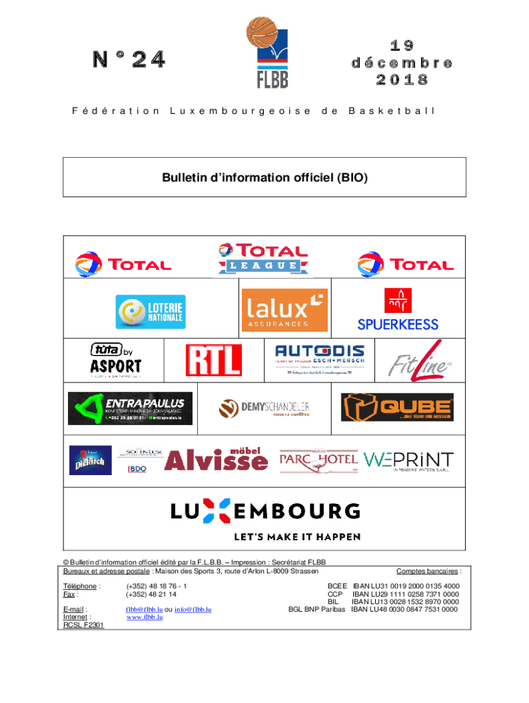 19 December 2018N24 F d r a t i o NL u × e m b o u r g e o i s ed ex an s k e t b a ll Bulletin information official (BIO) Bulletin information official it pars la F.L.B.B. Impression : Secretariat