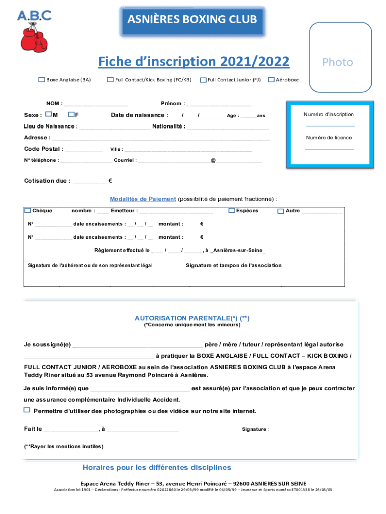 ASPIRES BOXING Cliché inscription 2021/2022 Box Angriest (BA)Full Contact/Kick Boxing (FC/KB)NOT : ___See :Full Contact Junior (FJ)PhotoAroboxePrnom : ___Date de Renaissance : ___ / ___ / ___ Age