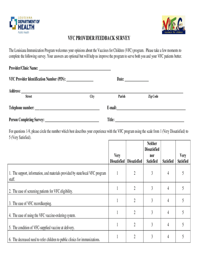 AFC PROVIDER FEEDBACK SURVEY The Louisiana Immunization Program welcomes your opinions about the Vaccines for Children (AFC) program. Please take a few moments to complete the following survey. Your