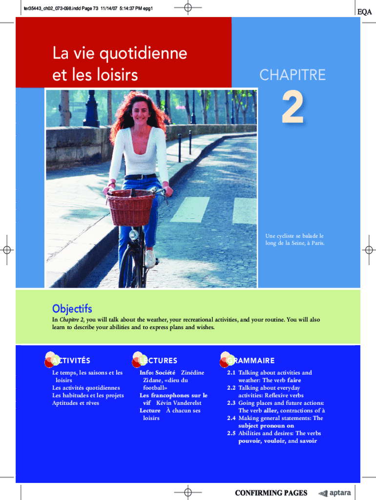 Ter35443_ch02_073098. Indy Page 73 11/14/07 5:14:37 PM epg1La vie quotidian ET LES loisirsCHAPITRE2 One cyclist's SE blade LE long DE la Seine, Paris. Objectify In Chapter 2, you will talk about the