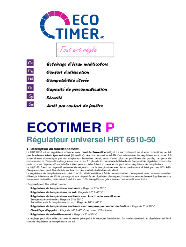 Tout est RTL cleavage Duran multicolored Comfort utilization Compatibility love Capacity depersonalization Security Art par contact de fentreECOTIMER P Regulate universal HRT 651050 1. Description