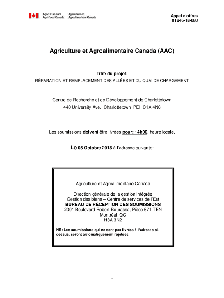 Appeal d\'offers 01B4618080Agriculture et Agroalimentaire Canada (AAC)Title Du project: REPARATION ETR EMPLACEMENT DES ALLIES ET DU QUASI DE CHARGEMENTCentre de Recherché et de Development de Charlottetown