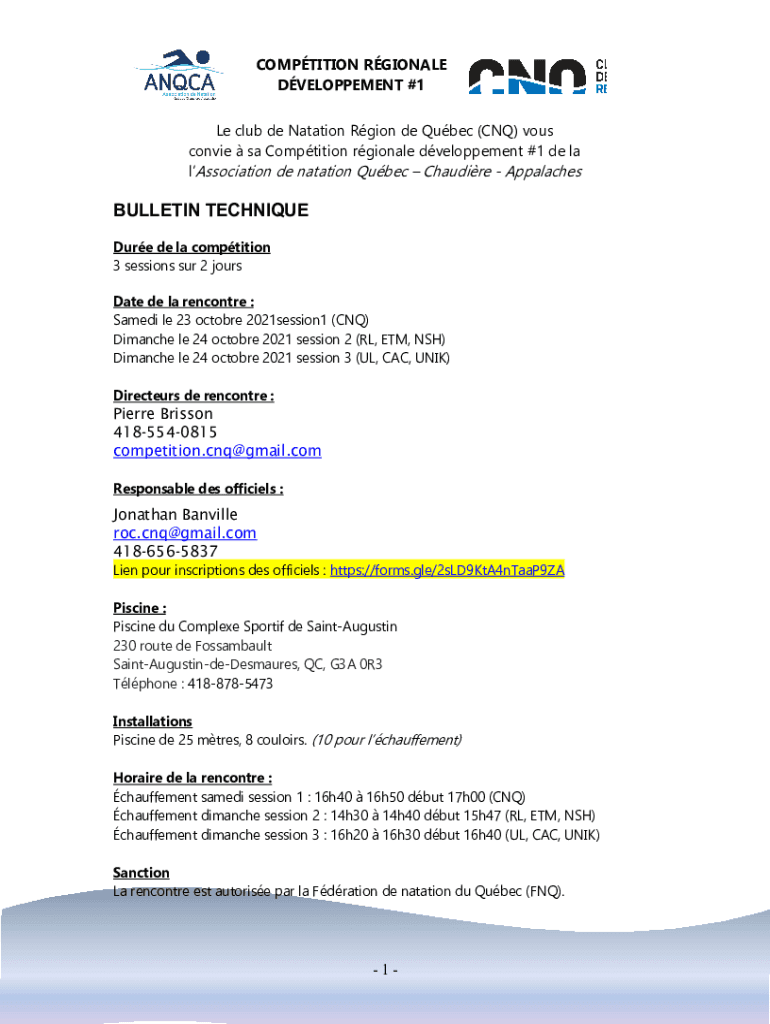 COMPETITION REGIONAL DEVELOPMENT #1 Le club DE Notation Region de Qubec (CNQ) vows Connie SA Competition regional development #1 DE la association DE notation Quebec Claudine AppalachesBULLETIN TECHNIQUE