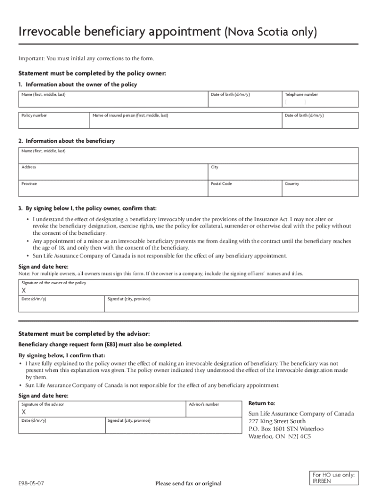 Irrevocable beneficiary appointment (Nova Scotia only) Important: You must initial any corrections to the form. Statement must be completed by the policy owner: 1. Information about the owner of the