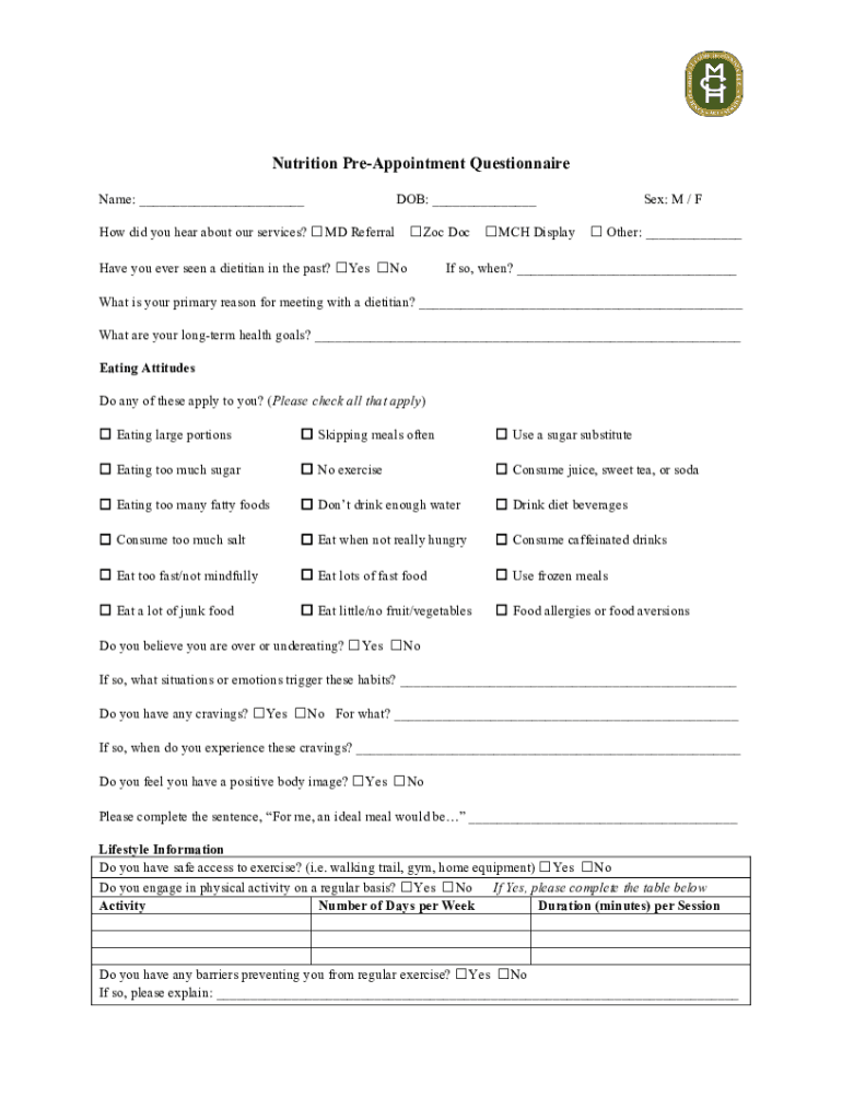 Get the free Nutrition Pre-Appointment Questionnaire