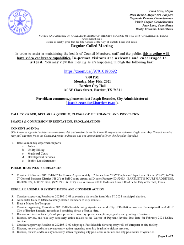 Chad Meet, Mayor Dean Room, Mayor Protector Stephanie Romero, Councilwoman Vickie Cooper, Councilwoman Jesse Luna, Councilman Bobby Freeman, Councilman NOTICE AND AGENDA OF A CALLED MEETING OF THE