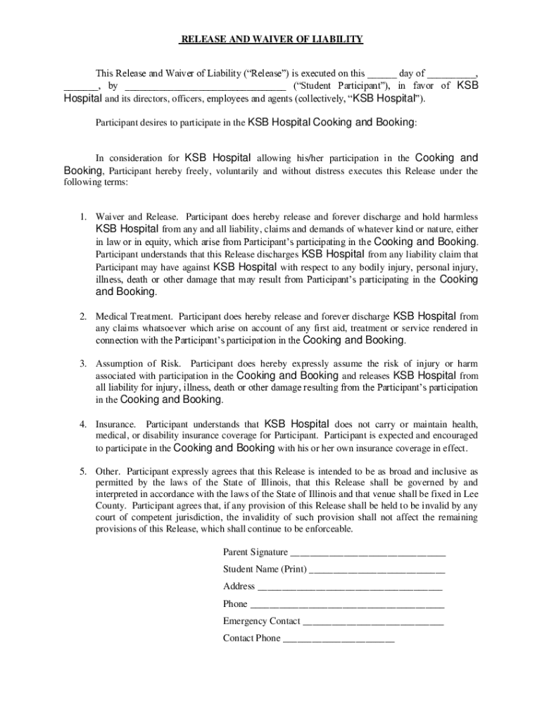 RELEASE AND WAIVER OF LIABILITY This Release and Waiver of Liability (Release) is executed on this ___ day of ___, ___, by ___ (Student Participant), in favor of KGB Hospital and its directors, officers,