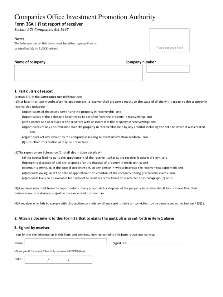 Companies Office Investment Promotion Authority Form 36A | First report of receiver Section 273 Companies Act 1997 Notes The information on this form must be either typewritten or printed legibly